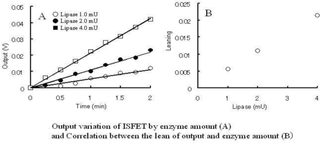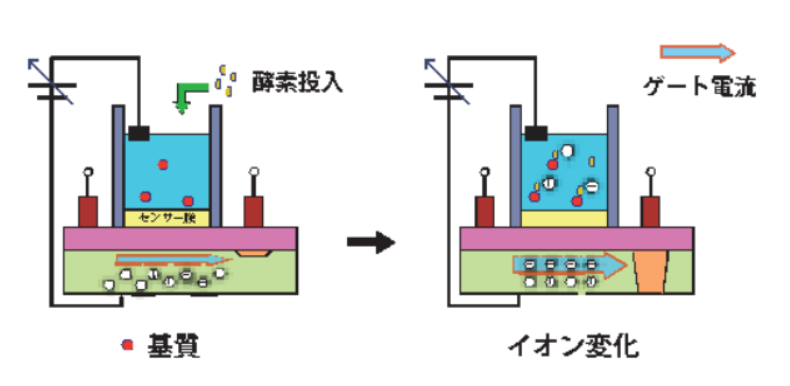 酵素反応等により生じる化学イオンの変化が半導体内の電子分布を変化させ、その結果、内部電子密度が変化してゲート間を流れる電流量が変化する。